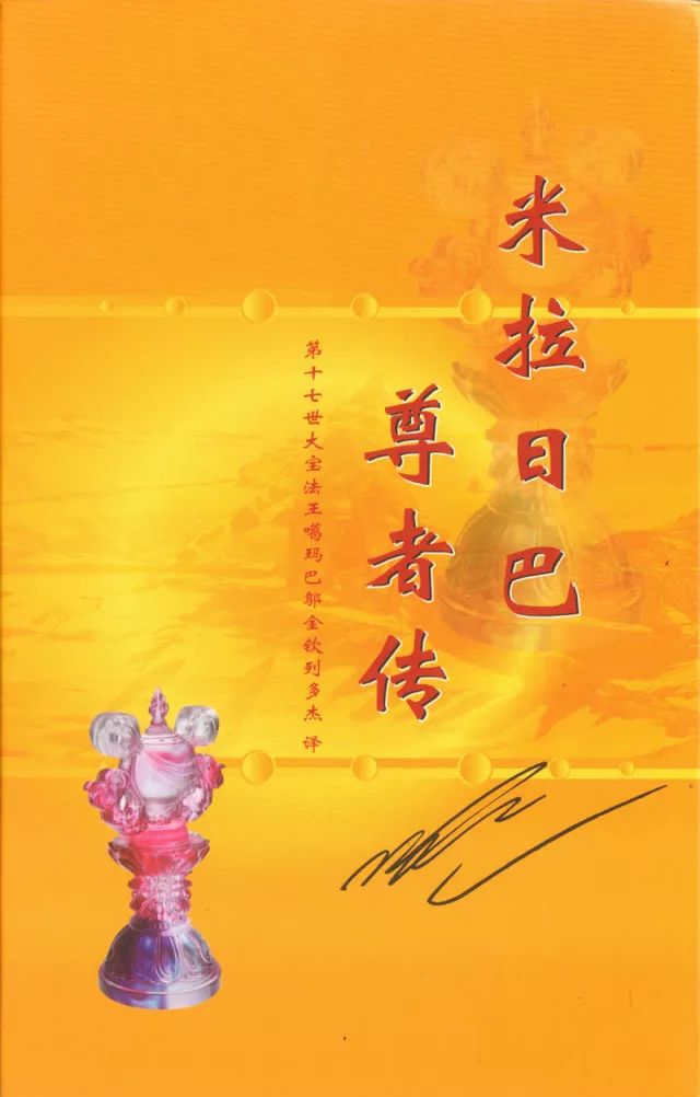 于本无无明云之法身天空界中。色身手之昼夜依怙。根本无魔水之罗睺。放射出事业智悲之光芒。无边威德炽燃故。消除遍及所知之一切事。六道五趣众生生处。痴迷时所摄之一切生命之法之所有黑暗客尘。因光芒故。远离因毒箭所生不善。回遮一切已入于蕴所引之道。及将入果之觉受体验。获得安乐休息。复将其安置于解脱因道。而于今生赐予果自在海。向名号米拉具足十力之等空有情之德怙敬礼。于您心之大悲海中。涌动利生事业浪。以智滴与信等摩尼宝填充我蹄迹心。来消除一切烦恼烦热及贫困。具爱士夫以善妙庄严。于集聚空闲处时。虽希冀梵行。但难以抵挡青春壮色威德之步伐故。如喜当下之欢喜。迷人美丽的传记。以大悲心之庄严。有缘人一入耳根时。自矜隐匿。但因稀有威德。而忍不住暗笑大笑。当下跌入文字之喜宴中。彼之故。以传记摩尼宝之密印之信心精进香水擦拭。为利益众生。请上师空行惠赐开许。将其供养在佛教宝幢顶上。